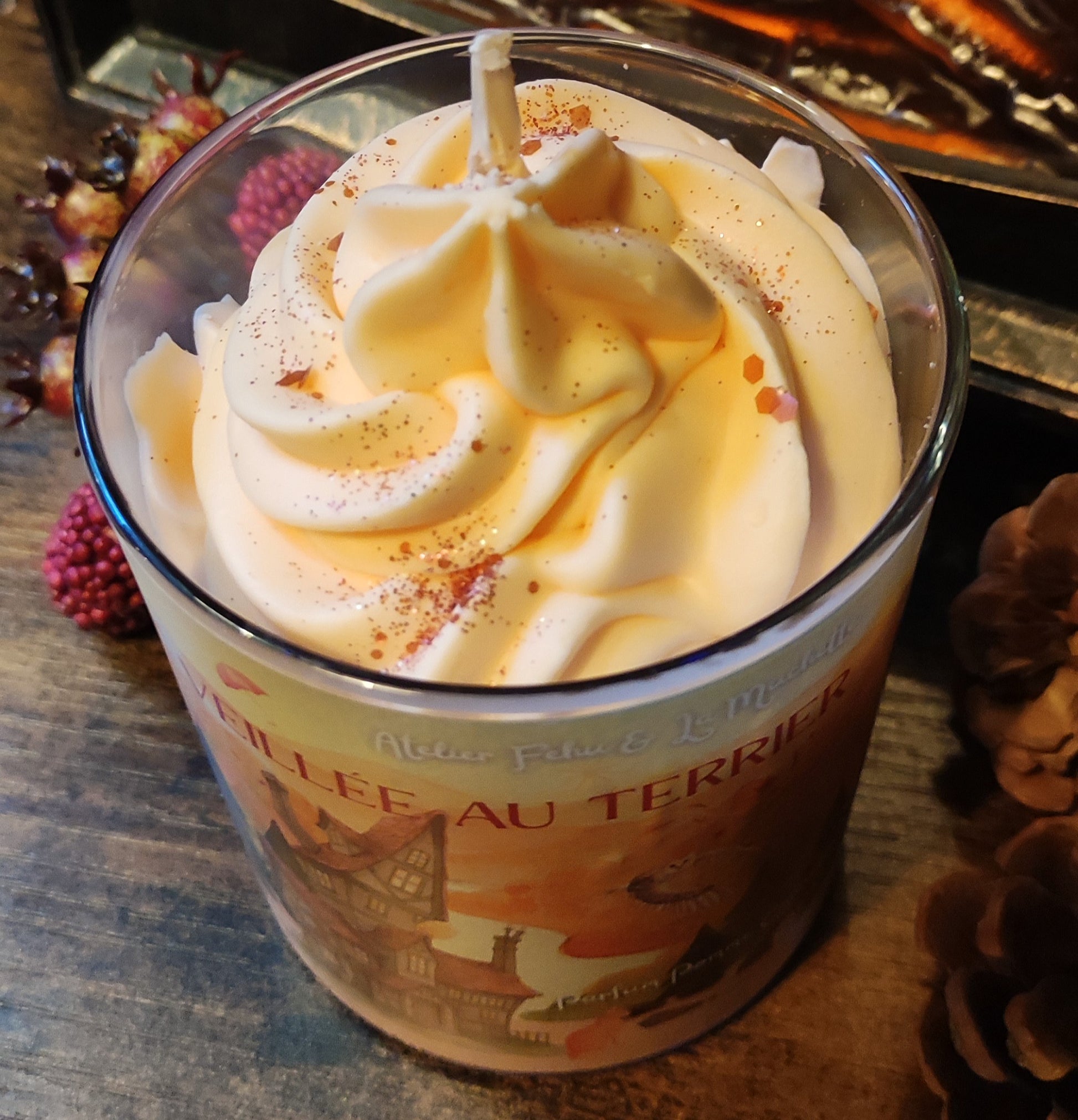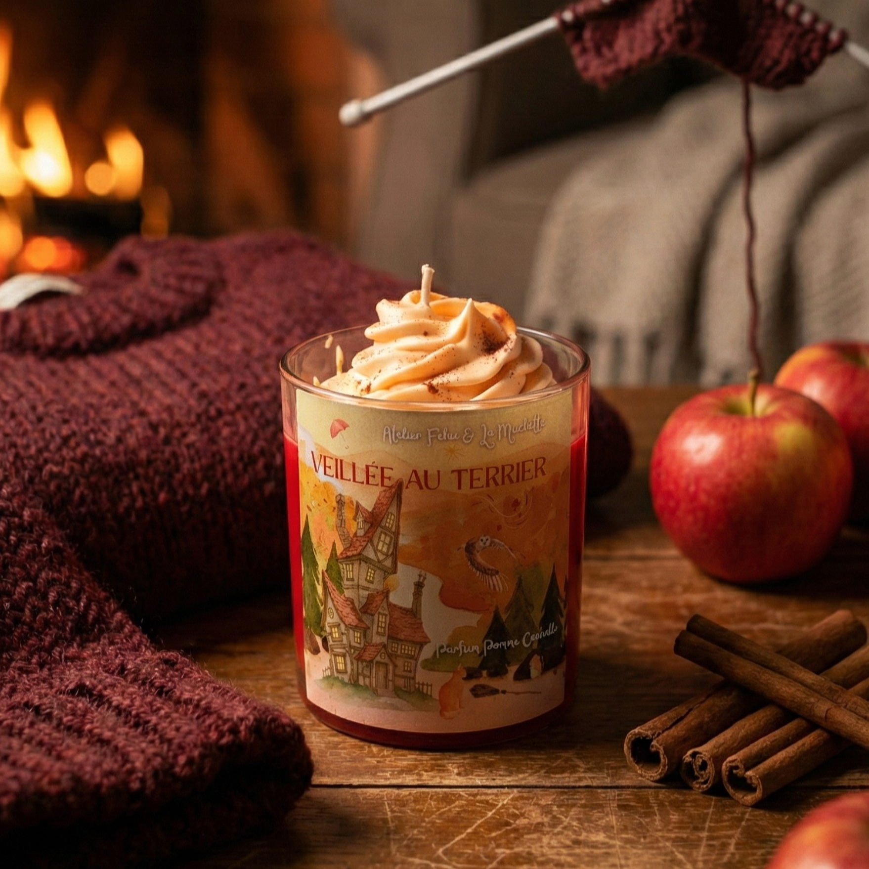 Fabriquée à la main avec soin, la bougie "Veillée au Terrier" diffuse un parfum envoûtant de pomme et de cannelle, qui évoque les douceurs cuites au four et les soirées passées autour de la table. Que ce soit pour créer une atmosphère cocooning ou pour embellir votre décoration, cette bougie est le choix parfait pour ceux qui chérissent les moments simples et magiques.