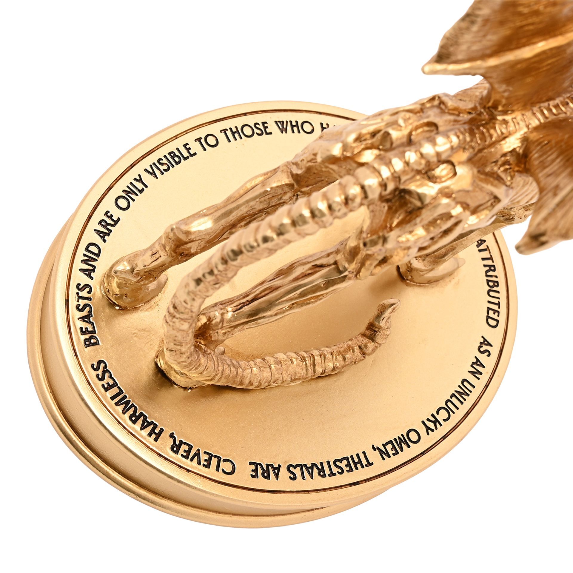 Cette pièce maîtresse capture l'essence de la créature magique la plus mystérieuse du Monde des Sorciers. Avec sa finition dorée et ses détails soignés, elle transforme une créature étrange en un véritable objet d'art. La figurine repose élégamment sur une base circulaire portant l'inscription gravée "The Thestral" (sombral en anglais).