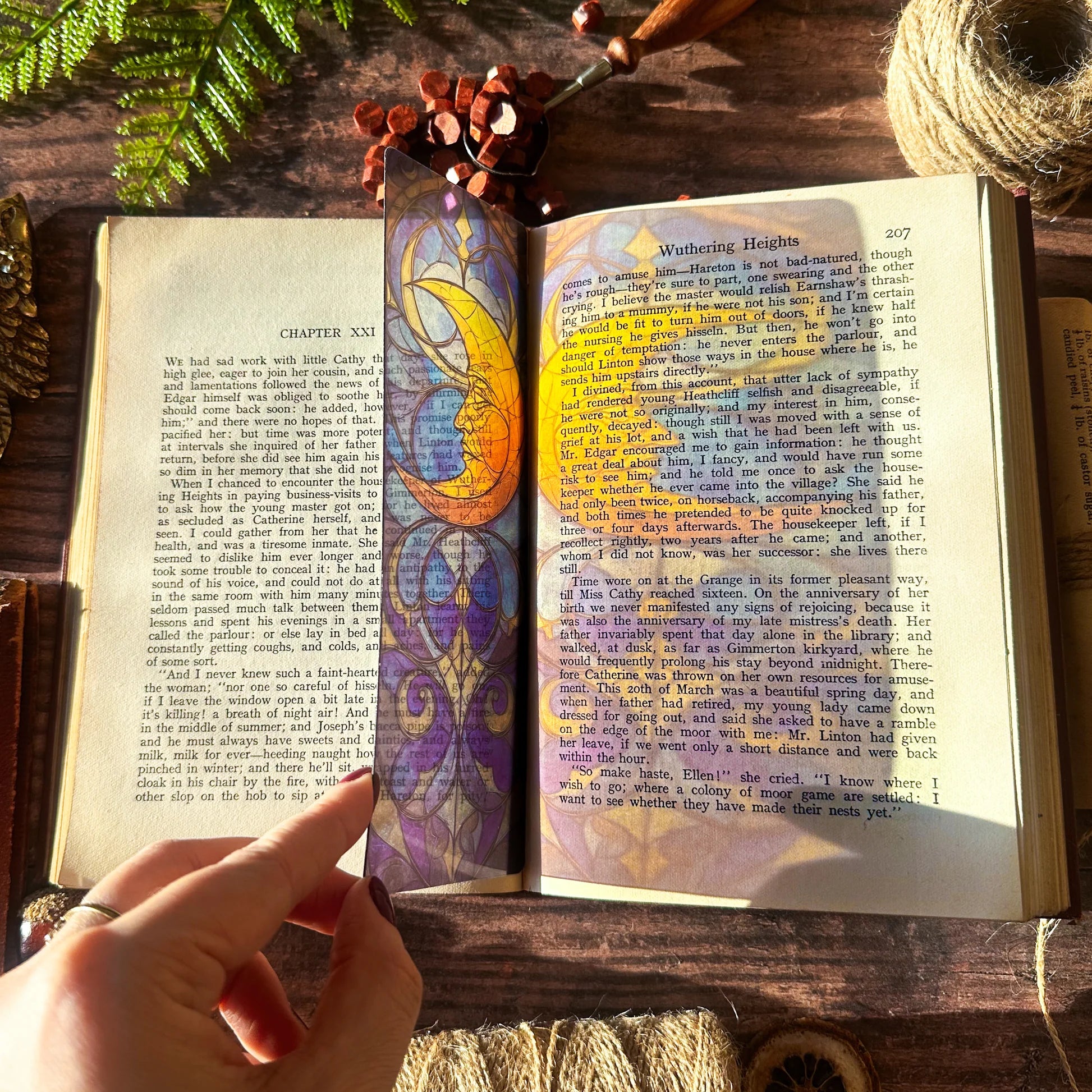 Laissez la douceur de cette lune céleste imprégner vos moments de lecture. Tel un vitrail ancien, ce magnifique marque-page capture une scène poétique de la lune.