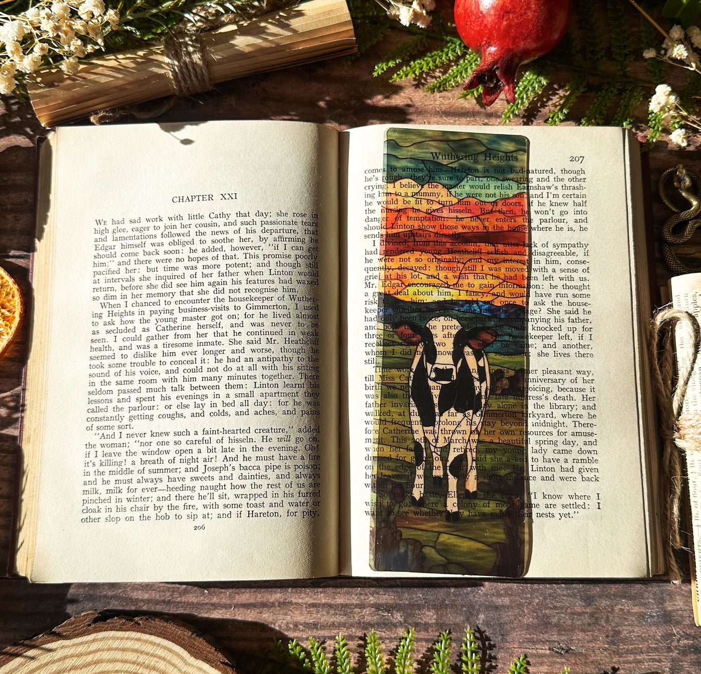 Laissez la douceur de la campagne irlandaise imprégner vos moments de lecture. Tel un vitrail ancien, ce magnifique marque-page capture une scène bucolique où une vache paisible contemple le soleil couchant.