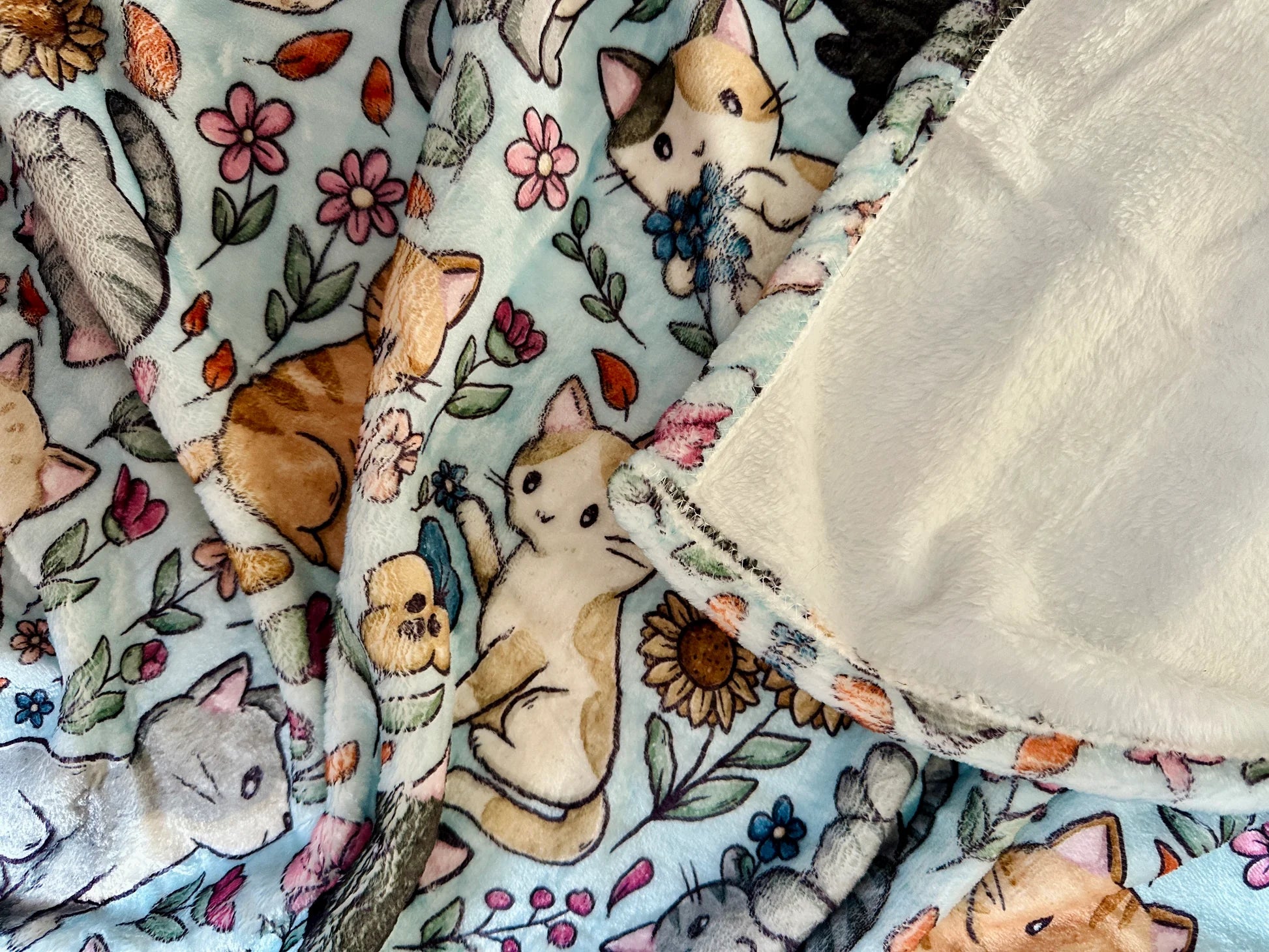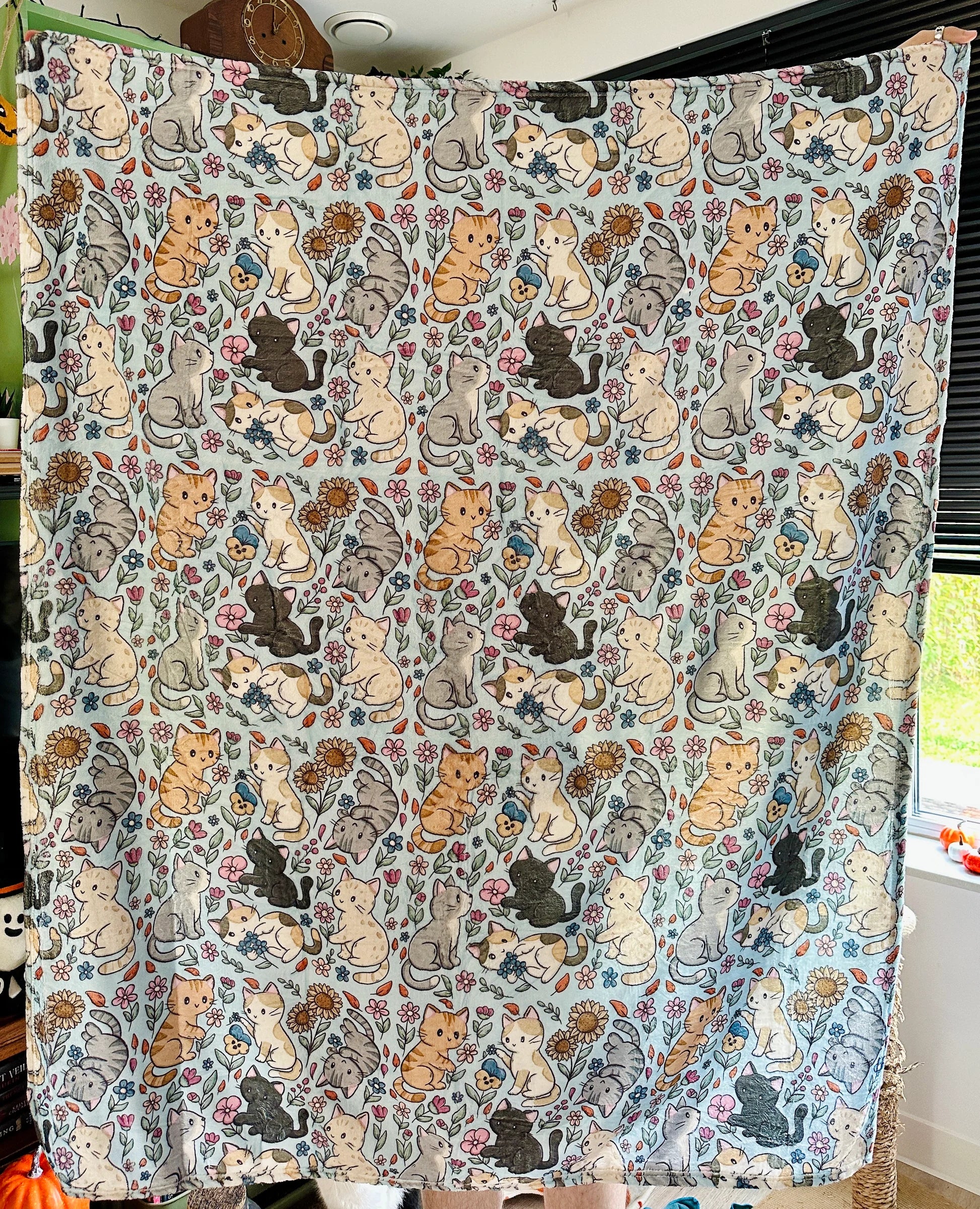 Enveloppez-vous dans la chaleur et la poésie de ce plaid, avec ses chats dans un champs de fleurs.
